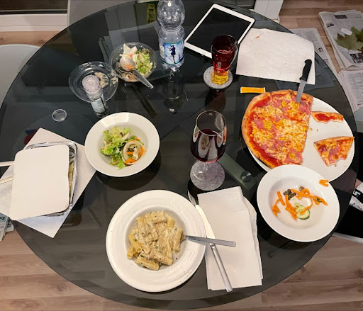 Die telefonische Reservierung am frühen Samstag-Abend hat uns noch einen Tisch für drei Personen erbracht. Wir waren kurz vor 20 Uhr im Lokal und wurden an einen Tisch „oben“ verwiesen. Dort angekommen hatten wir einen kleinen Tisch an der Galerie und wurden auch gleich von der freundlichen Mitarbeiterin nach unseren Getränkewünschen gefragt. Dabei hat sie uns die Speisekarte übergeben und nach dem Getränke servieren wurde auch gleich unsere Bestellung aufgenommen. Unsere Vorspeisen Fiocchi di Parma und gemischter Salat kamen zusammen mit einem Körbchen frischen Pizzabrot, die Tomatensuppe wurde mit einem weiteren Körbchen Pizzabrot dann etwas später serviert. Unsere Nudelgerichte Strozzapreti Salsiccia und Tagliatelli Salmone sowie Gnocchi Primavera kamen aber gemeinsam. Wobei wir nach den üppigen Vorspeisen mit den ebenfalls reichlich portionierten Hauptgängen letztendlich überfordert waren und einen Großteil in Alu-Schalen mit nach Hause nehmen konnten.
