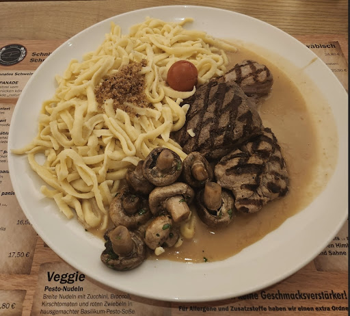 Read moreGemischte Gefühle... Fangen wir einmal mit dem Positiven an: Die Lage des Restaurants ist schön und ruhig - erwartet man so mitten in der Stadt nicht. Parkmöglichkeiten gibt es in der Nähe genug. Die Außenplätze sind auch schön gemütlich und haben genug Abstand zu angrenzenden Tischen. Leider ist das Essen nicht ganz so toll. Das Fleisch war mit wenig Geschmack und sehr trocken - ich weiß nicht wo das Fleisch bezogen wird, aber ich denke hier ist in der Qualität noch Luft nach oben. Klar muss man sagen, dass das Preisniveau hier günstig bis mittelpreisig ist, aber dennoch möchte man ja guten Geschmack. Lieber weniger Fleisch auf dem Teller und dafür hochwertiger. Die Portionen sind nämlich wirklich riesig. Satt wird man hier allemal. Auch beim Hamburger kann man nicht groß meckern, aber das viel zu trockene Brötchen und die fehlende Finesse machen das Essen etwas trostlos. Die Pommes wiederum waren gut.