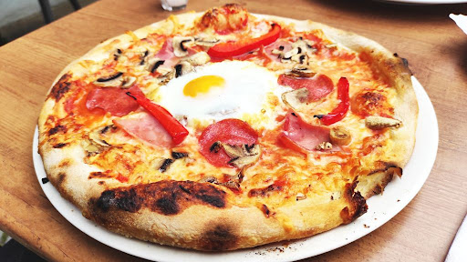 Nett ist es hier, drinnen wie draußen. Allerdings dauerte es etwas bis sich jemand für uns interessierte. Obwohl ich uns drinnen angemeldet hatte. Der Kellner welcher sich anschließend um und kümmerte war ausgesprochen nett und freundlich. Aber wohl auch geschäftstüchtig. Auf der Aufstelltafel entdeckten wir Spaghetti aus dem Parmesanlaib. Das liebt meine Frau und wurde bestellt. Der Kellner fragte noch ob wir frische Trüffel darauf haben wollte, was wir bejahten. Zuvor orderten wir einen Insalata Italiana welcher uns recht bald und in reichhaltiger Form erreichte. Gut der einfache Hinterschinken darauf war etwas teilnahmslos. Was wir auch gerne haben ist, wenn der Salat etwas durchgehender angemacht wäre. Er war zwar mit ganz ansprechendem Balsamico beträufelt aber ganz ohne Menagerie hat man da manchmal kaum was davon abbekommen. Im Grunde war es aber ein guter Salat, den wir (mitsamt Menagerie) wieder bestellen würden. Der Trüffel wurde am Tisch über die Spaghetti gehobelt. Recht dick sogar. Aber geduftet hatte der Trüffel nicht. Und geschmacklich blieb er bis auf eine gewisse „Nussigkeit“ auch zurück. Ich tendiere stark auf Billigware aus dem Reich der Mitte. Die Spaghetti selbst waren leider nur noch lauwarm und haben sich nicht recht mit dem Parmesan verbunden. Darum wurden wohl ein paar Parmesannester abgekratzt und darunter gemischt. Das war, zusammen mit der Tatsache, dass die Spaghetti noch extrem al dente waren, nicht wiklich schmackhaft. Dafür war die Pizza richtig gut. Dünner knuspriger Boden und ein leicht aufgegangener aber nicht schwerer Rand wurde belegt mit würzigem und einigermaßen reichhaltigem Belag. Das hatte mir sehr gut geschmeckt. Daß das Spiegelei der Pizza Sorpresa im Elektroofen eine glasige, feste Schicht oben drüber bekommt ist dafür weniger toll. Da sollte man vielleicht eine andere Zubereitungsabfolge in Erwägung ziehen.