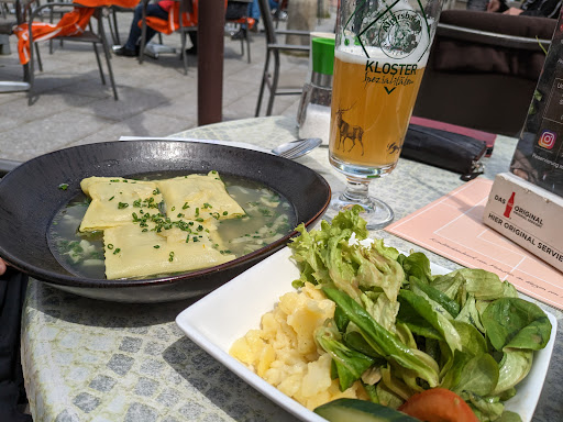 A very comfortable place to sit and enjoy a tasty lunch or snack in the main plaza of Freudenstadt. The inside is also nice if the weather isn't cooperative. We got vegan Maultaschen and Semmelknödel in Champignonrahmsoße, both of which were delicious. They have a wide variety of cakes inside as well if you're craving something sweeter or would like dessert. Unfortunately the prices for the portion sizes is ridiculous. 12€ for two small Semmelknödel from a cafe is outrageous. The beer we ordered was pretty far from being full as well. In addition to that, the owner (presumably?) is very unfriendly. She got unnecessarily sassy with my husband when he asked if they had vegan options for cakes since they they weren't labelled as such, and she was less than patient with me as well when I was ordering a piece of cake myself. Enjoyed our lunch, but we...