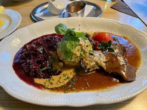 Read moreSchon von außen ist das Gebäude bezaubernd schön anzusehen, edel, malerisch und geschmackvoll dekoriert. Einige Treppen führen nach oben, in dem langen Flur kann man historische Bilder von dem Anwesen bewundern. Das Restaurant selbst ist urig eingerichtet, man fühlt sich in alte Zeiten versetzt - die Einrichtung ist stilvoll und bequem. Der Inhaber ein äußerst freundlicher, charmanter, aufmerksamer und humorvoller Mann. Man fühlt sich sofort willkommen und wohl. Das Essen ist fantastisch: Kalbsschnitzel so zart, dass es fast auf der Zunge zergeht, handgeschabte Spätzle, super in der Konsistenz und feiner Geschmack, die hausgemachten Preiselbeeren sind ebenfalls zu empfehlen. Auch die Braten-Sauce ist hervorragend. Der gemischte Salat ist ebenfalls super lecker, eine feine Salatsauce und bunte Sorten. Der Kartoffelsalat darin ist äußerst gelungen, tolle Konsistenz, super gewürzt. Alles frisch, keine künstlichen Geschmacksverstärker erkennbar. Auf Wunsch kann man das Gericht auch als kleine Portion bekommen, der Inhaber ist sehr aufmerksam und freundlich, geht auf die Kundenwünsche ein. So war auch noch Platz für einen kleinen Nachtisch. Sie haben sogar Walnusseis (mein Favorit) im Programm, das schön angerichtet serviert wird - siehe Bild. Das andere Essen habe ich leider nicht fotografiert, aber es war optisch wie kulinarisch ein Highlight. Vielen Dank und bis hoffentlich...