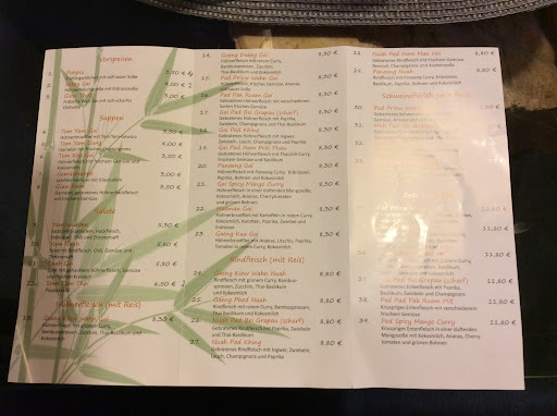 Read moreSehr schöne Überraschung. Der Wirt ist ein sehr guter Gastgeber voller natürlicher Freundlichkeit. Ausgezeichnete Beratung. Insgesamt sehr gute Küche. Den Schärfegrad von 1-10 bestimmt man selbst in Absprache und Beratung mit dem Chef und das passt dann auch exakt. Besonders hervorzuheben waren die Kokossuppen bei denen endlich einmal das Zitronengras nicht so übertrieben dominierte, wie bei den meisten anderen Thai's. Das war wirklich perfekt und harmonisch abgestimmt. Unsere Vegetarierin in der Gruppe fand, dass der Friteusengeschmack bei der vegetarischen Ente zu dominant sei. Bei meinem Kristallweizen von einer kleinen, mir bisher unbekannten Brauerei lag der Geschmack leider daneben. War ein ziemlich flaches, wässriges Bier. Dafür kann der Betrieb aber nichts. Hier könnte man vielleicht mal an den Stellschrauben ein wenig drehen. Preise gehen voll in Ordnung . Insgesamt dennoch eine...