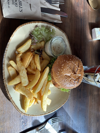 Wir waren auf der Durchreise und hatten uns entschlossen hier gemütlich essen zu gehen. Schon beim Betreten um kurz nach 18 Uhr war die erste Frage, ob wir reserviert hatten. Als wir dies verneinten hieß es gleich es wäre ein Tisch frei aber nur bis 19:30 Uhr. Wir fragten, ob es möglich wäre, Fall bis dahin noch ein Tisch frei wäre, auch länger zu bleiben. Das wurde direkt verneint. Es sei bis auf den letzten Tisch ausgebucht. Wir wurden zu unserem Tisch nach oben gebracht, direkt neben den Treppen. Kurz darauf wurde auch die Getränke Bestellung aufgenommen und auch zügig gebracht. Ich Brauchte noch kurz um mich für ein Gericht zu entscheiden und kurz darauf war die Bedienung schon wieder am Tisch. Wir entschieden uns für die Vorspeisenplatte für 2 Personen, einen Burger und ein Rumpsteak. Die Vorspeise wurde sehr schnell gebracht und war auch sehr lecker ! Als der Teller abgeräumt wurde kam direkt der Herr vom Anfang und fragte ob die Vorspeise noch gar nicht gebracht wurde, als wir ihm sagten sie war schon da uns sehr lecker ging er wortlos wieder. Hier fing es an, dass ich mich unwohl gefühlt habe. Auf die Art schnell schnell ihr müsst wieder gehen. Das Lokal leerte sich langsam. Keine 5 Minuten später kam der Hauptgang, was ich für gut befand habe, der Hunger überwiegt. Während dem Essen kam der Herr vom Anfang immer wieder und mir kam es so vor, als würde er schauen, wie weit wir schon sind. Im Minutentakt „rannten“ die Mitarbeiter die Treppe hoch um andere Gäste zu bedienen. Durch die Holztreppe wurde es sehr laut und ungemütlich. Wir bestellen während dem Essen noch ein Getränk da es oben sehr warm war. Das begeisterte den Herren wohl nicht wirklich und als er gerade am Nachbartisch war stand auch schon das Trinken auf dem Tisch. Der Burger und auch das Steak waren wie die Vorspeise hervorragend ! Aber für mich entwickelte sich der Abend zu einem Riesen Stress und mir verging der Appetit. Darauf hin fragte ich, ob man den restlichen Burger einpacken konnte, ich wollte ihn später essen da es echt super lecker war. Er wurde mir wie auf dem Bild in die Box gepackt oder geleert. Ich kann es nicht sagen. Wir waren um kurz nach 19 Uhr fertig. Kurz nach halb 8 kam der Herr vom Anfang und meinte, wir können bleiben. Daraufhin verlangten wir die Rechnung, da wir uns nicht wohl fühlten.