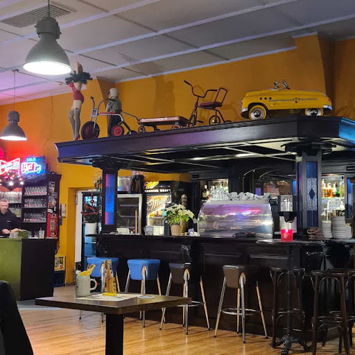 Der Hauptraum ist im Stil einer amerikanischen Biker Bar ausgelegt mit vielen dekorativen Elementen wie eine Zapfsäule und Figuren, die zudem auch überall im Ort stehen. Innen hatte ich etwas den Eindruck eines modernen Saloons mit all dem Holz und halben Birkenstämmen als Träger. Platz ist für 150-200 Gäste, es empfielt sich vorher anzurufen und einen Tisch zu reservieren, da es voll werden kann, dabei aber nicht zu laut wird. Im Sommer gibt es auch einen Außenbereich, die vor dem Gebäude liegende Straße ist aber wenig befahren und daher keine Verkehrsgeräusche stören sollten (wie das in der Woche ist kann ich nicht sagen). Lieferdienst gibt es keinen, man kann aber was bestellen und selber abholen und es wird Catering ab 15 Personen angeboten (Extern und Intern nehme ich an, für Details einfach anrufen). Über a la Carte Gerichte einfach bei den anderen Bewertungen schaun, aber ich kann den Ort auf jeden Fall empfehlen, wenn man ein Deutsch-Amerikanisches Lokal sucht.