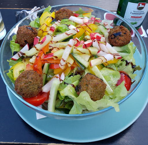 The food was fine and we had a decent time. However, the Pizza Dinnele Tomate was good but quite small. Also, we ordered a flafel bowl salad, only to recieve a normal leaf salad (priced at €9). After we pointed this out, they brought out the falafel (which was nice). That meant that the leaf salad was now a falafel bowl and the price got raised to €14. That's €5 for 6 rather small balls of falafel. Yes, the falafel was good but not THAT good. Finally, the sauce on the salad was too much and made...