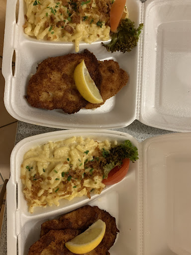 Wir bestellten zwei Schnitzel (Huhn) mit Käsespätzle sowie eine Portion Kaiserschmarrn. Leider waren die Schnitzel viel zu dunkel und schwer zu essen, weil sie zu lange in der To-Go-Box waren. Es scheint, als ob das Essen wahrscheinlich in nur 10 Minuten zubereitet wurde und dann einfach dort nur stand. Vielleicht handelte es sich lediglich um den Standard-Satz des Herren am Telefon. (Kommen Sie einfach in 30-45 Minuten vorbei) Am Ende liegt es dann wohl im Glück oder Pech des Einzelnen. Die Konsistenz ähnelte eher einer Schuhsohle. Die Käsespätzle hatten wenig mit Käse zu tun; sie waren sahnig (was man an deren Konsistenz schon erkennen ließ) und ließen den Käsegeschmack vermissen. Die angepriesenen Röstzwiebeln, die auf der Karte angegeben waren, waren kaum vorhanden. Dann kann man diese auch weglassen.