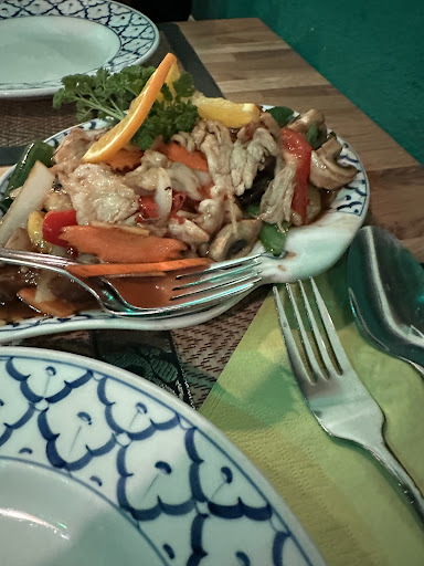 Wir hatten eine Reservierung für 4 Personen. Der Tisch war fertig und wir machten uns pünktlich daran, die sehr umfangreiche Karte zu studieren. Die Auswahl ist riesig, und um es gleich vorweg zu sagen: uns kam das Essen sehr authentisch vor! Das ist kein altbekannter „Asiate“, sondern ein thailändisches Restaurant. Es gibt viele Vorspeisen, noch mehr Hauptspeisen und einige Desserts. Es gibt vegetarische Varianten, der Tofu schmeckt auch noch richtig gut! Die Portionen sind groß, das Verhältnis zwischen Fleisch und Gemüse bzw Nudeln oder Reis ist ausgewogen, und der Geschmack ist einfach fantastisch. Wir waren mit einem anderen Paar, das noch keine Berührungspunkte zu Thai Food hatte, und die waren ebenfalls restlos begeistert. Das Preis-Leistungs-Verhältnis ist überdurchschnittlich gut, würde ich sagen, Wir kommen jetzt öfter, weil wir schon gespannt sind, die vielen anderen Gerichte zu probieren. Zum trinken gibt es auch 3 thailändische Biere: Singha, Chang und Leo. Sehr cool!!!