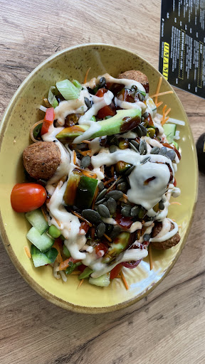 Ich habe mir hier die Veggie Deluxe Bowl bestellt. Diese besteht aus Reis, diversem Gemüse, Falafelbällchen und Soßen. Das Gemüse ist schön knackig und frisch oben auf dem Reis angerichtet. Es sieht auch sehr schön aus. Vom Geschmack her muss man schon unbedingt auf einen sehr starken Teryaki Geschmack stehen. Dieser überlagert alles. Denn der Reis ist komplett ungewürzt. Meiner war auch etwas zerkocht. Schien ein klebriger Sushireis zu sein, wobei der natürlich beim Sushi dann noch mit z.B. Reisessig gewürzt wäre. Das Gemüse war sehr frisch und roh. Ebenfalls dementsprechend nicht mariniert oder anderweitig gewürzt. Oben drauf, das Topping bestand aus diversen Körnern und anscheinend 3 Soßen, wobei man tatsächlich nur die dominante Teryaki Soße geschmeckt hat. Die Falaffelbällchen passten da auch nicht so ganz in das Konzept dieser Bowl.