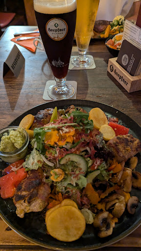 Wir sind heute auf dem Wohnmobilstellplatz des Ortes gelandet und von dort aus zum "Otto's" gegangen. Das Lokal war ziemlich gut besucht aber wir haben noch Platz an der Theke bekommen. Die Karte war dann eine ungewöhnliche Überraschung. Sie bestand zum großen Teil aus Salaten. Großer Blattsalat mit....., oder großer gemischter Salat mit....... Wie entschieden uns für den großen Blattsalat mit gegrilltem Schafskäse und Datteln im Speckmantel und eimem großen Blattsalat mit Champignons und Schweinefilet. Dazu Bier und Radler. Der Salat war einfach nur köstlich. Bei jedem Bissen, ein anderes Geschmackserlebnis. Wirklich außerordentlich gut. Bier war auch lecker. Zum Schluss gab es noch einen regionalen Apfel Zimt Likör. Lecker! Zudem ein toller, in sich ruhender Wirt, bei dem .man merkt, dass ihm das was er da tut einfach Spaß macht. Ambiente gemütlich und schön. Für uns ein...