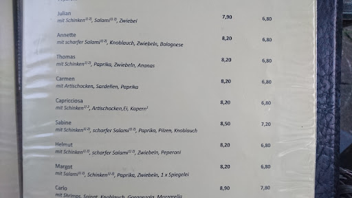 Die Pizzen sind leider unterdurchschnittlich und haben auf ganzer Linie enttäuscht. Hat mit einer italienischen Pizza gar nichts zu tun. Der Boden ist ein flacher, harter Keksteig. Man konnte sogar die Spuren der Stipprolle erkennen mit der der Teig behandelt wurde, damit er bloß nicht aufgeht. Ist mir völlig unverständlich. Der Käse ein normaler geriebener Pizza-Käse-Gastro-Mix. Kein Mozzarella. Die Beläge von mittelmäßiger Qualität. Nicht schlecht, aber vom Geschmack her keine Highlights. Insgesamt erinnert die Pizza durch ihren harten Keksboden und den 08/15 Käse eher an eine Tiefkühlpizza obwohl ich das keinesfalls unterstellen will. Es ist sehr schade, weil wir in vorherigen Besuchen mit dem Essen zufrieden waren. Jedoch hatten wir da keine Pizza sondern Fleischgerichte. Die waren immer ganz gut.