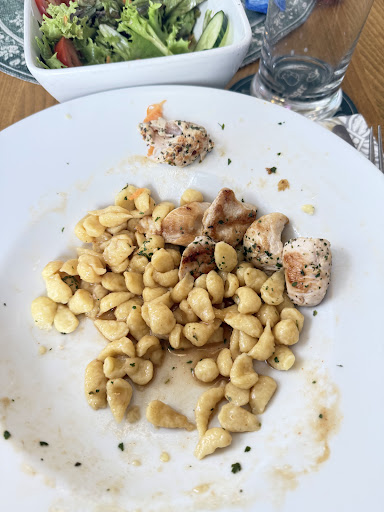 Ich habe noch nie eine 1 Sterne Bewertung abgegeben, aber wenn ich könnte, würde ich dafür auch gar keinen geben 😔. Uns hat es hierher geführt, da das Lokal von außen wirklich schön und ansprechend aussieht, aber das war es dann auch schon.. Leider! Preis - Leistung passen hier leider gar nicht zusammen. Ich hatte Spätzle mit Geschnetzeltem und Bratensoße.. Spätzle verkocht Soße (wenn ich sie gefunden habe welche kaum vorhanden war) schmeckte überhaupt nicht und hatte mit einer Bratensoße leider nichts zu tun und dann zu dem Geschnetzelten, es waren eine handvoll angebratener Hähnchen Würfel oben auf den Spätzle angerichtet.. Thats it.. Mein Mann bekam sein Schnitzel nachdem wir alle fertig mit essen waren und der Nachbarstisch (der später kam wie wir) sein Essen bekam. Burger waren für 14 € etwas klein und die Pommes muss man extra dazu bezahlen, was man aus der Karte so nicht heraus gelesen hat und der Kellner es einem aber so anbietet bei der Bestellung 🤯. Ich könnte noch ein paar Punkte mehr ansprechen, aber in den davor erwähnten Rezensionen steht eigentlich alles drin was gesagt werden muss. Es ist weder überspitzt noch übertrieben. Leider enttäuschend und vielleicht sollte der Inhaber sich mal ein paar Rezensionen zu Herzen nehmen und...