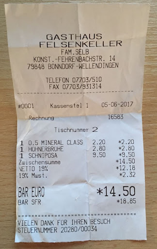 Read more2 Personen haben zeitgleich direkt nach dem Essen extremen Durchfall bekommen. Im Restaurant musste jeder mehrfach auf das WC, die Heimfahrt war die Hölle, alle paar Meter musste angehalten werden. Das einzigste was gleich gegessen wurde war eine Hühner Suppe. ist zwar komisch im Sommer eine Suppe zu essen - stand aber ganz normal auf der Karte. Drei weitere Personen am Tisch hatten keine Probleme mit dem Magen, hatten aber auch keine Hühnersuppe als Vorspeise und andere Hauptgerichte. Der Vorfall ist schon ein paar Tage her, dennoch will ich diesen "Nachtrag" nicht vorenthalten. Kassenzettel vom 05.06.2017...