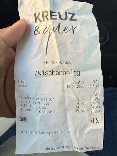 Rechnung für drei Essen und drei Getränke knapp 60 Euro. Resümee: Wer so viel Geld für das Essen fordert, sollte auch entsprechende Qualität liefern. Sorry, aber das war unterste Stufe. Da ess ich lieber in der Dorfwirtschaft,...