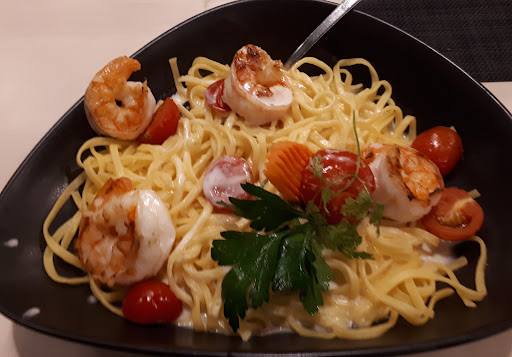 Wir bestellten: Käsespätzle, Fettuccine mit Garnelen und Steak Medium. Der Wunsch nach Pommes aus Süßkartoffeln kostete bei einem Gericht von mehr als 25 Euro 1,50 extra. Ich gratuliere! Die Käsespätzle waren genießbar, wenn auch etwas lieblos angerichtet und der Geschmack stammte überwiegend vom würzigen Käse. Bei Fettuccine erwartet man idR. Bandnudeln und keine flach geklopften Spaghetti von ca. 2,5 mm Breite. Immerhin gab es glatt vier gebratene Garnelen garniert mit verdörrter Petersilie und drei Blättern Maggi-Kraut. Die Soße, vermutlich gestreckte Sahne pur, ohne Geschmack. Da half auch das Nachwürzen mit dem vorhandenen Salz-Pfeffer-Streuer nichts. Schon mal etwas von Kräutern gehört? Das Steak wurde Medium bestellt und Rare serviert. Sollte es der Koch nicht wissen: Kerntemperatur kontrollieren oder einen Flächengrill benutzen, der das automatisch macht. Das beiliegende Gemüse war eiskalt.