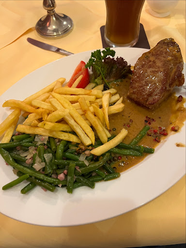 Ich hatte das Trioler Schnitzel, welches in der Karte mit Bergkäse und Schinken, sowie einer Essiggurke gefüllt beschrieben war. Das Schnitzel schmeckte auch sehr gut und man erkannte die handwerkliche Zubereitung. Allerdings fand ich, dass es wie ein „normales“ Cordon Bleu schmeckte und der Tiroler Charakter nicht unbedingt hervordrang. Die Soße war sehr fein. Die Rösti leider TK Ware was bei einem Preis von über 20 € eher negativ auffällt.