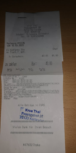 Am 16.03.2023 kauften mir meine Kollegen zum Geburtstag einen Essensgutschein über 40 EUR für das Restaurant Krua Thai, Passagenhof 26 in 76133 Karlsruhe. Als ich diesen am 29. Juli. 2023 einlösen wollte, musste ich feststellen, dass es besagtes Restaurant nicht mehr gibt. Der neue Restaurantbetreiber gab mir den Hinweis, dass ehemalige Inhaber auch ein Restaurant in Bruchsal betreibt. Ich trat mit diesem umgehend in Kontakt, schickte ein Foto des Gutscheins (ein Kassenzettel mit Aufdruck „Gutschein“) und bat um Rückerstattung. Es wurde mir gesagt, dass man in Urlaub sei und sich nach Rückkehr am 07.09.2023 darum kümmern werde. Am 17. September und 14. Oktober 2023 habe ich erinnert und um Erledigung gebeten. Am 14. Oktober 2023 wurde mir die Überweisung zugesagt. Da bis 30. Oktober noch immer kein Geldeingang vorlag, erinnerte ich erneut. Erneut wurde mir die Erledigung zugesagt.
