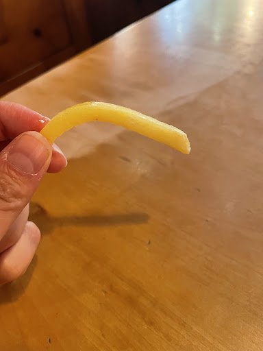 Geschmack: Pommesfrittes mit ca. 4 bis 5mm Schnitt matschig, nicht durch und versalzen. Cordonbleus haben vermuttlich noch nie eine Pfanne/Friteuse gesehen. Die Pammenade war mehlig, fad und matschig. Der Schinken streng und der Käse passte geschmacklich nicht dazu. Nachdem meine Tochter uind ich diese Cordonbleus gegessen haben (Preis ca. 15EUR), hatte zumindest meine Tochter eine Magenverstimmung. Dadurch, dass diese Geschmäcker nicht zusammen passen hat sich bei mir sogar der Magen gekrampft ("Ich will das nicht in mir haben"). Hat sich fast angefühlt wie Achterbahn fahren. Der Kartoffelsalat schmeckt nach NAFA-Kartoiffelsalat, die Frikadelle war im Gegensatz zum Cordonbleu geniessbar.