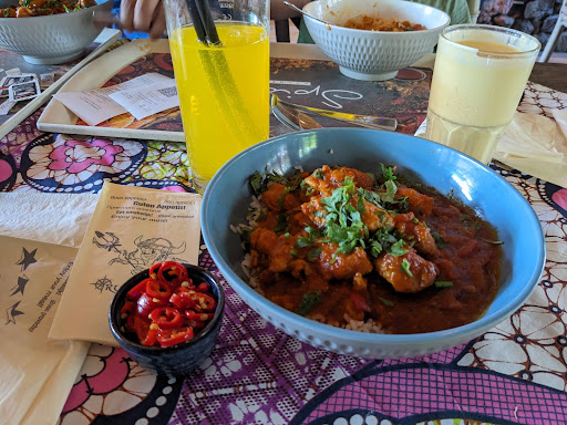 He had a cape chicken curry, which was great. I had a safari mix (bit of everything without seafood, there is a different mix including seafood). To be completely honest, i loved this mix of stuff. Especially the Bobotie and the naan bread dipped in the green coriander dip were...