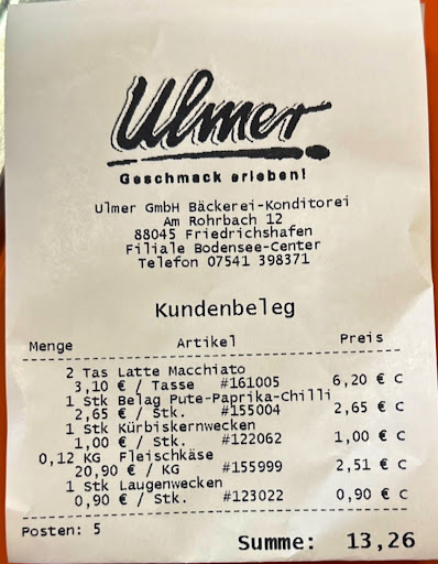 Read moreWollten am offenen Sonntag, ( Stadtfest )nach Ankunft in Friedrichshafen und einer 6 stündigen Anreise um 16 .Uhr 25 noch Kaffeetrinken. Wurden aber beim betreten barsch angebellt " wir schließen 17 Uhr und die Kaffeemaschiene ist schon gereinigt" ( der Kuchen wurde schon weckgeraümt ) wohlgemerkt nicht mal16Uhr 30. Auch wenn Brot und Backwaren uns zusagen , Kunde waren und werden wir bei Ulmer wohl nicht, auch wenn Friedrichshafen uns wiedersehen wird, ...