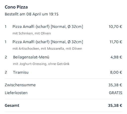 Ich bin unglaublich enttäuscht und wütend über diese Erfahrung. Pizza Cono hat sich als extrem unzuverlässig und unprofessionell erwiesen. Ich werde hier nie wieder bestellen und kann es niemandem empfehlen. Spart euch Zeit, Geld und Nerven und bestellt...