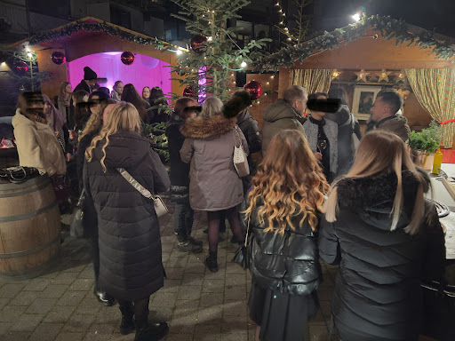 Schon bei der Ankunft gab es aus zwei hübschen Weihnachtsmarkt-Buden im Hof Glühwein oder Prosecco und als Amuse-Gueule hervorragende, frisch gebackene kleine Dinnele-Stückchen (schwäb. Flammkuchen).