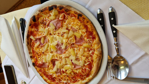 Zum ersten ist zu sagen, daß die Pizza geschmaklich gut war aber eine sehr sehr trockene Angelegenheit war. Die Tomstensosse war nur durch die rote Farbe zu erkennen ansonsten war diese durch das Backen vollständig verdampft. Der Belag mit Schinken hätte durchaus grosszügiger sein dürfen!!!!! Preisleistung: Note: 2.5