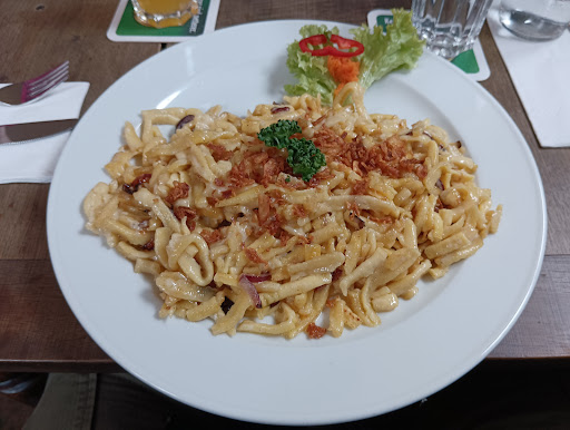 Read moreEl restaurante se ubica en el centro de Haslach, lo que otorga una ubicación conveniente. Atienden en horario más extendido de lo habitual. La comida está bien, con unas porciones de buen tamaño. Pedimos kasserpatzle, pollo y schnitzel. La carne quedó bien de punto, la pechuga de pollo y el cerdo no estaban nada secos, bastante jugoso. El spatzle estaba bien. El servicio regular. No son lentos, pero la camarera (puede que dueña) no resultó muy agradable. Si eres o hablas alemán parece que es agradable, con detalles con los niños. Si hablas otro idioma su carácter cambia. Echo espuma por la boca cuando nos escuchó hablando español, ella pensaba que era francés. Además hace comentarios (no solicitados) sobre el tema con mesas de otros comensales. Luego hablando en inglés, se enteró de que hablábamos en español y nos contó sus viajes a Marbella. Después de eso solo hablaba alemán...menos mal que puedo defenderme en el idioma. Luego hablando en inglés, se enteró de que hablábamos en español y nos contó sus viajes a Marbella. Después de eso solo hablaba alemán. Fuera tienen un cartel con el menú y ponen que tienen carta en inglés y francés. Solo lo vimos en alemán, y me parece que en francés va a ser...