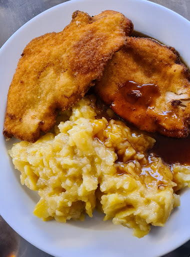 Enttäuschung Nummer 2. Nach ner halben Stunde, nachdem er ständig neue Gäste bedient hatte, wollte ich doch mal wissen wo mein Essen bleibt. Tja, hatte er total vergessen. Hat sich entschuldigt und ich bekam dann mein Schnitzel. Geschmacklich war es "gewöhnlich". Menge war ok. Aber für 12 €, incl. 0,33 Cola, hätte ich was besseres erwartet.