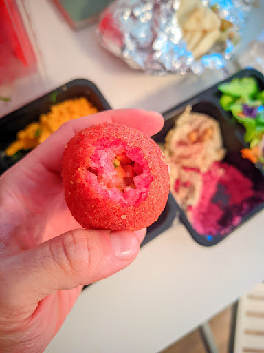Alles, was auf den Bildern zu sehen ist, hat mir gefallen. Ich konnte nichts Negatives im eigentlichen Sinne feststellen. Die Lieferung war schnell, das Essen sieht frisch aus und schmeckt auch so. Der Bulgurreis ist gut, die Falafel absolut gelungen, der Salat frisch, und auch der Hummus ist gelungen.