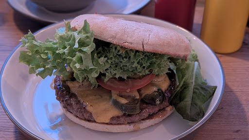 Zuerst probierte ich den Cheeseburger. Das Brötchen stammt, soweit ich weiß, von einem regionalen Handwerksbäcker und machte einen sehr guten Eindruck: schön soft, aber stabil genug, um nicht auseinanderzufallen. Salat, Tomaten und Gurken wirkten frisch und ansprechend. Auf dem Burger war eine typische Cocktailsauce. Das Patty selbst war leider recht dünn und deckte das Brötchen nicht vollständig ab, was das Verhältnis zwischen Fleisch und Brötchen unausgewogen wirken ließ. Geschmacklich war der Burger solide – kein absolutes Highlight, aber gut. Ich hätte mir ein etwas dickeres, lockerer geformtes Patty gewünscht, das nicht ganz durchgebraten ist. Als ich das Fleisch separat probierte, fiel mir auf, dass es leicht gummiartig wirkte, vielleicht weil es zu stark gepresst wurde. Der Käse hätte außerdem komplett geschmolzen sein sollen, war aber an einigen Stellen noch kalt und fest.