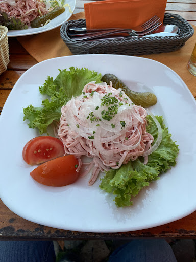 Der badische Wurstsalat kam in einer großzügigen Portion daher und bestand aus feinen Streifen von Lyoner Wurst. Abgerundet wurde das Gericht durch knackige Zwiebelringe und eine dünn geschnittene Essiggurke. Die Marinade war perfekt abgestimmt: eine harmonische Balance aus Essig und Öl, die dem Salat eine angenehme Säure und Leichtigkeit verlieh. Besonders erfreulich, dass die Küche bei beiden Gerichten auf die Zutat von Maggi verzichtete.