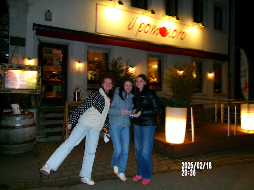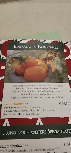 Vor ein paar Wochen eröffnet, war es gemischter Salat mit Karotten, Gurken, Tomaten und Zwiebeln noch Tomino con speck, talienischer Weichkäse im Speckmantel gebraten mit Birnen, karamelisierten Walnüssen, Honig und Balsamicoccreme. (11.50€). Zum Hauptgang gab es eine kl. Portion Spaghetti "Carbonara“,Spaghetti mit Ei, Speck, frischem Pfeffer, Parmesan in Sahnesauce (9.50 €) und einmal - einmaliges in Konstanz - Pizza “Gialla“ mit Sauce aus gelben Tomaten, scharfer italienischer Salami (Spianata), Rucola, Büffelmozzarella (14.20 €) jeweils dazu einen Insalata mista - gemischter Salat mit Karotten, Gurken, Tomaten und Zwiebeln. Zum Abschluss gab es Tiramisu hausgemachtes Löffelbisquit und Mascarponecreme (6.90 €)