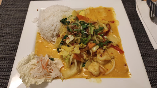 Vegetarische Frühlingsrollen waren ok, wenn auch etwas schwach im Geschmack (auch die Sauce süß-sauer). Die Sommerrollen waren außen zäh und innen teils sehr hart (habe ich aber für meine Frau, welche dies bestellt hatte aufessen können). Das Reisgericht war nicht lecker und das erste Gericht was ich in einem Restaurant habe stehen lassen. Der Reis war leicht verkocht und dennoch minimal angetrocknet, die Sauce schmeckt leicht seltsam aber auch etwas nach Erdnuss und irgendetwas vom Gemüse war unerwartet stark bitter. Das Eis habe ich nicht probiert, da es meine Frau bestellt hatte, aber sie fand es furchtbar und beschrieb da Kokosnusseis als besonders eigenartig im Geschmack.