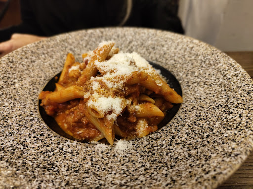 Die Speisen: Bruschetta: Als Vorspeise wählten wir Bruschetta, die etwas anders serviert wurde als gewöhnlich: Statt fertig belegter Brote bekamen wir feine, geröstete Brotscheiben und die Zutaten zum Selbstbestreichen. Diese unübliche Art fanden wir dennoch lecker, da man sie so nach eigenem Geschmack belegen konnte. Leider habe ich von dieser Vorspeise keine Fotos gemacht. Pizza: Meine Pizza war lecker, besonders der Teig, der für mich immer ein wichtiger Indikator für gute Handwerkskunst ist. Der Boden war geschmackvoll und hätte auch ohne Belag überzeugen können. Der Parma-Schinken wurde gegen Ende frisch auf die Pizza gelegt, genau wie es sein sollte. Insgesamt war die Pizza sehr gut – nicht herausragend, aber definitiv überzeugend. Penne a la Bolognese: Meine Freundin fand ihre Pasta ebenfalls gut, allerdings fehlte ihr das gewisse Etwas, weshalb sie sie eher als "befriedigend" (3 von 5) bewertete. Beim Probieren empfand ich sie eher als solide 4 von 5, mit Luft nach oben.