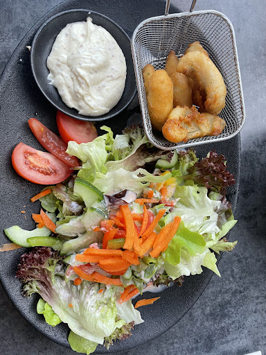 Dazu Fischknusperle in einer Schale, die nicht mal ansatzweise gefüllt war (s. Bild: 5 Stück, von der Größe wie ein halbes „normales“ Fischstäbchen.) Meine Begleitung hatte sich für die Käsespätzle entschieden, bei denen ein Beilagensalat inklusive war. Genau der selbe Salat, wenn nicht sogar größer von der Portion.