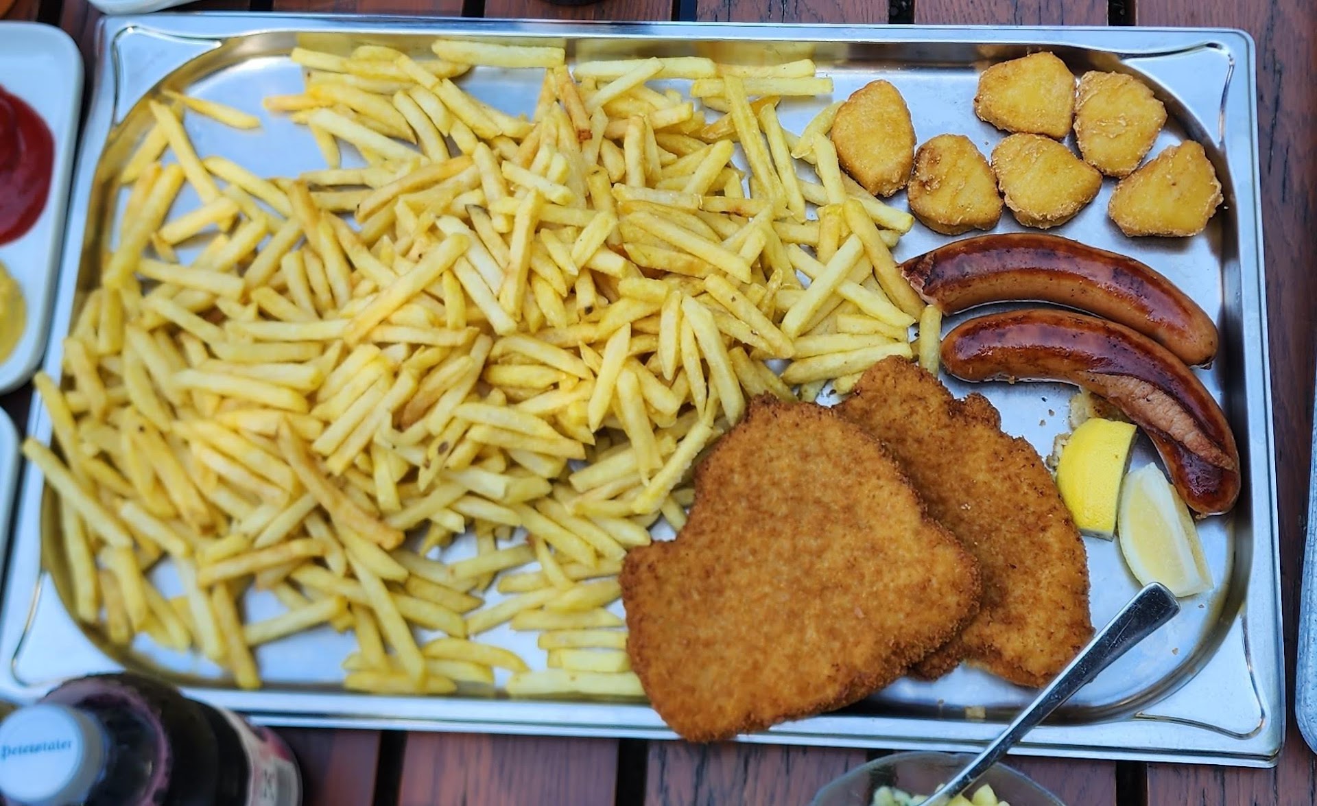 The food was okay — it is not exactly the healthiest options: include french fries, schnitzel chicken nuggets, and potato salad, cake and coffee, etc. it is a buffet line. The drinks are overpriced. €3,60 for Coke and sprite. See our receipt. €2,80 with the reusable cup but we got charged twice for the “deposit” for one cup. 5 stars for service because they gave us 2 euros back when we asked. The downside is you have to get back in line, the entire line, and wait to see the cashier for your deposit back since there’s 1 cashier...