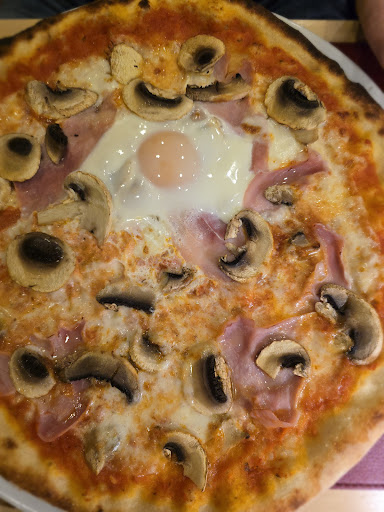 Pizza mit Schinken, Champignons und Ei Diese Pizza war perfekt gebacken – ein knuspriger Rand, saftiger Belag und das Ei in der Mitte sorgten für eine wunderbare Kombination. Die frischen Champignons und der herzhafte Schinken ergänzten sich hervorragend mit dem würzigen Käse und der Tomatensauce.