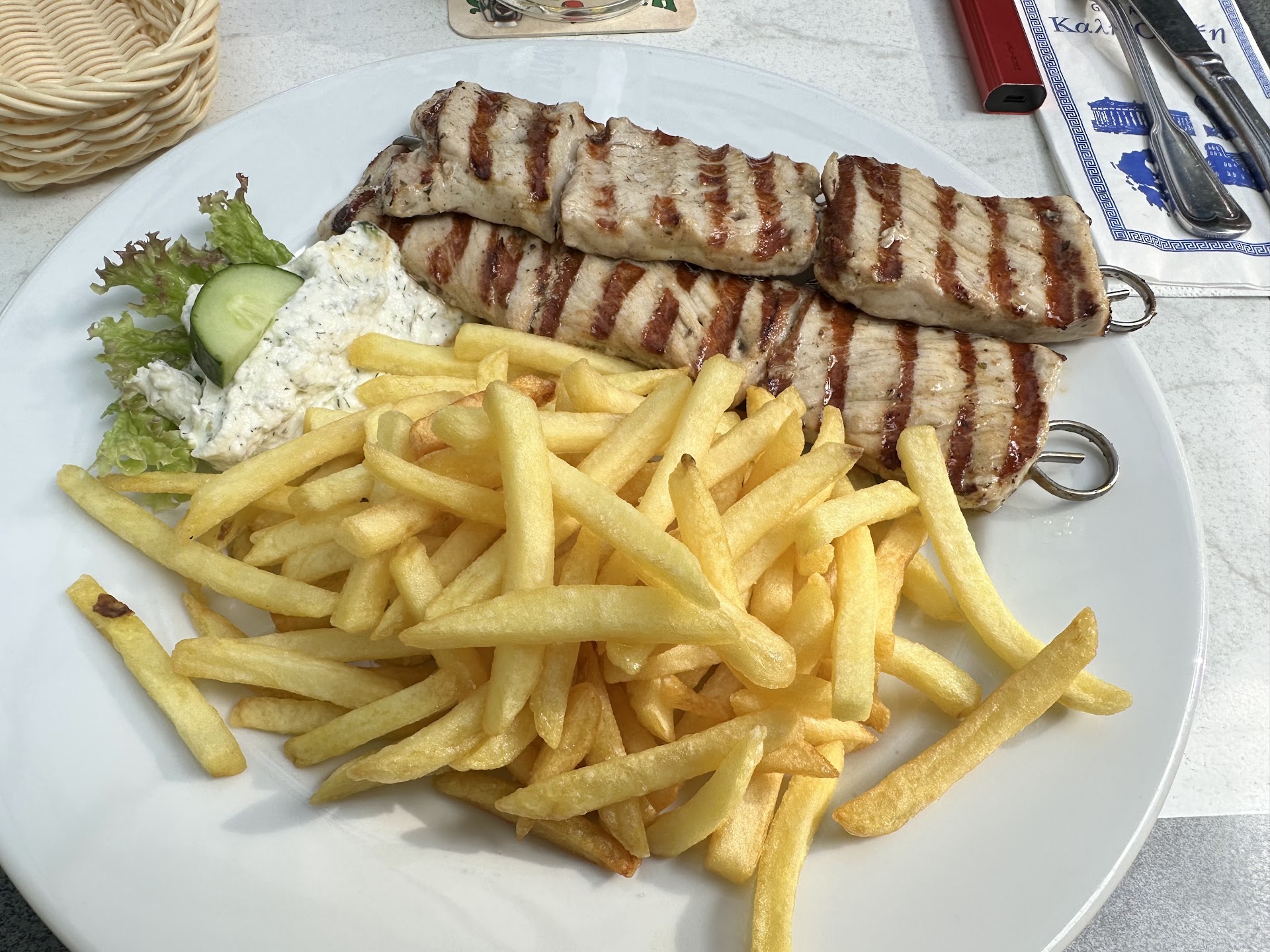 Read moreIch war mit meiner Freundin während unseres Kurzurlaubes im Dionysos essen. Natürlich haben wir das Restaurant über Google gefunden und auch die bisherigen Bewertungen gelesen. Vielen von diesen waren aber schon sehr alte Bewertungen und es waren auch sehr gute dabei. Also fiel die Entscheidung für einen Besuch. Angekommen im Restaurant nahmen wir auf der Terrasse bei schönem Wetter platz. Meine Freundin bestellte sich ein Putensteak mit Reis, Pommes und hauseigener Soße. (Wohlbemerkt das einzige Geflügelgericht in der Karte) Ich hingegen ein überbackenes Gyros mit Pommes. Für jeden eine große Cola. Nach kurze Zeit waren die Getränke am Tisch. Nur dass die Gerichte nach nicht einmal 10min am Tisch ankamen fande ich sehr verwundernswert. Kann es sich hier um frisches Essen handeln? Weiter: Ich war mit meinem Essen ganz zu frieden. Soße vom Gyros hat mittelmäßig geschmeckt und die Portion war ausreichend. Meine Freundin hingegen war garnicht zu frieden und das kann ich verstehen. Die kompletten 2 kleinen Putensteaks waren horizontal von einer Sehnenschicht oder Gewebeschicht durchzogen. Die Soße fande sie auch nicht besonders.
