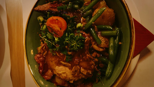 We ordered the cheese and beef soup as appetizers. The fried cheese comes with slices if bread that I think no one ever needs. The beef soup was delicious but unfortunately that was the only acceptable food for the night. Main dish were schnitzel and schweine medallions and Käsespätzle , the schnitzel came with soggy and cold potatoes. Really old. The pork in the other dish was not cooked well. 2 beers and 2 house wines and we paid 80€. Not...