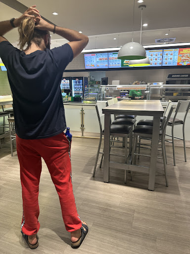Hinter der Theke, die offensichtlich schon lange nicht mehr gereinigt wurde, standen drei hilflos wirkende Männer, die nicht einmal ihre eigenen Soßen kannten und die Subs schlecht zubereiteten. Das Brot wurde zu früh aus dem Ofen genommen und die Beläge lieblos auf meinen Sub geklatscht. Als ich mich schließlich hingesetzt hatte und den ersten Bissen nahm, fand ich zwischen dem braunen Salat auch noch zwei Männerhaare.