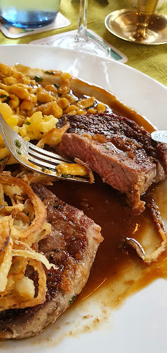 Read moreSehr schöne Örtlichkeit, passend zur Umgebung. Der Tagesgastrobereich ist historisch-rustikal und gemütlich eingerichtet. Der große Saal hingegen stilvoll und modern. Sehr nette und höfliche Servicekräfte. Wir wurden schnell, vollständig und richtig bedient, obwohl das Restaurant zu dem Zeitpunkt voll war. Zumindest gemessen am Zwiebelrostbraten gibt es für mich deutlich weniger Punkte. Es ist kein Zwieberostbraten wie man es sich gewöhnlich vorstellt. Das Fleisch soll zwar von einer Färse sein, aber ich bezweifle, dass es ein Roastbeef war. Zudem war es für mich viel zu dünn geschnitten (ca. 1cm - eher fast wie ne Schuhsohle) und damit war es auch nicht möglich, diesen wie bestellt "englisch" zubereitet zu servieren. Der war viel zu durch, wenige Röstaromen weil er ja nicht zulange angeröstet werden konnte. Lieber ein bisschen schmaler, dafür dicker ( 3 cm). Zudem von Fett und Sehnen durchzogen. Ich denke auch, dass Fleisch war auch das Falsche hierzu gewesen.