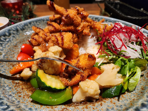 The Hanoi Deluxe was a large bowl topped with varying pieces of fish, scallops and fried shrimp, but the bowl was filled with mostly salad and rice noodles. These made that the fish although seared immediately cooled off, and it was a cold bowl of chewy fish. The side was a mound of rice which had been covered a cross hatch of ?!mayonnaise?! and another sauce.