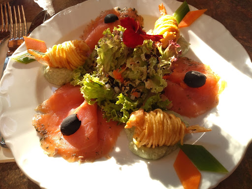 Als Vegetarierin habe ich geschmacklich leider immer schon ein bissel das Nachsehen gehabt aufgrund recht geschmacksneutraler Soßen. Vor den ebenso neutralen Nocken in verschiedenen Variationen kann ich leider auch nur warnen. Ok, wer es mild mag ist damit vielleicht gut bedient. Wer Würze erwartet, wird enttäuscht. So war es leider auch gestern wieder, mit dem Unterschied, dass es nicht nur mich erwischt hat. Das Weihnachtsbuffet zum stolzen Preis von 28,50 € erfüllte jedenfalls nicht die Erwartungen. Mal abgesehen davon, dass der Nachtisch nicht inbegriffen war. Einzige Vorspeise war ein Maronensüppchen. Es duftete köstlich, aber ich war ja gewarnt und nahm nur einen Löffel. Zum Glück, denn für meinen Geschmack war es eindeutig zu süßlich geraten. Sehr schade, denn ansonsten wäre es tatsächlich recht gut gewesen. Danach dann das Salatbuffet, was diesen Namen eigentlich nicht verdiente. Eine Schüssel frischer Salat, ansonsten lediglich Rohkost in Form von Karotten, Kraut und Rettich sowie einem Gurkensalat. Da hätte ich mir doch zumindest frische Tomaten, Gurken, Paprika gewünscht, halt ein paar frische Zutaten mehr. Zweites mal Schade. Die Krönung des Disasters war dann das warme Buffet. Lachs mit Spinat in Blätterteig hörte sich ja gut an. Barbarie-Ente in Röllchenform, die genaue Bezeichnung habe ich schon vergessen, las sich auch interessant. Dann gab es noch Rehrücken mit Preiselbeeren. Dazu Butternudeln, kleine selbstgemachte Kroketten und Kartoffelgratin plus "Gartengemüse". Broccoli mit Tütensoße, abgeschmelzten Blumenkohl, Kohlrabi, Karotten, Rosenkohl mit Speck. Schön wär's gewesen. Der "Lachs" war fürchterlich. Kein Filet, wie erwartet bei angekündigtem Lachs im Blätterteig, sondern eine Art Mousse mit säuerlichen Ei-Sprenkeln, die nur fischig und nicht nach Lachs schmeckte. Die Entenrolle bestand nur zur Hälfte aus Ente, die andere Hälfte war wieder eine Art Mousse. Die Haut der Ente war gelb und nicht kross-braun. Wenig einladend selbst für Nichtvegetarier. Das Reh war laut Auskunft meiner Mit-Esser gut, nur zu trocken. Gut waren auch die Kroketten. Das Gemüse hatte noch sehr viel Biss, war aber wieder würzfrei. Was das Essen insgesamt anging, waren wir uns leider alle einig: Durchgefallen Schwarzwaldtanne! Sorry, aber das geht besser....