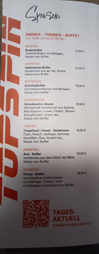 Gegenüber der guten Vor-Corona-Zeit hat sich auch im Topspin einiges geändert, vor allem beim Preis! Zur Mittagsstunde (Mo-Sa von 11:30-14Uhr) kostet das Lunch-Buffet mittlerweile 12,50€, dieses selber besteht immer aus einer Tagessuppe, einer Vielfalt an frischen Salaten und wechseldem unterschiedlichem Fleisch und Beilagen wie Gemüse, Teigwaren, Kartoffelvariationen oder Reis. Am Sonntag kostet das Buffet sogar 18,--€, das ist gegenüber früher (9.95€) nahezu eine Preisverdoppelung!