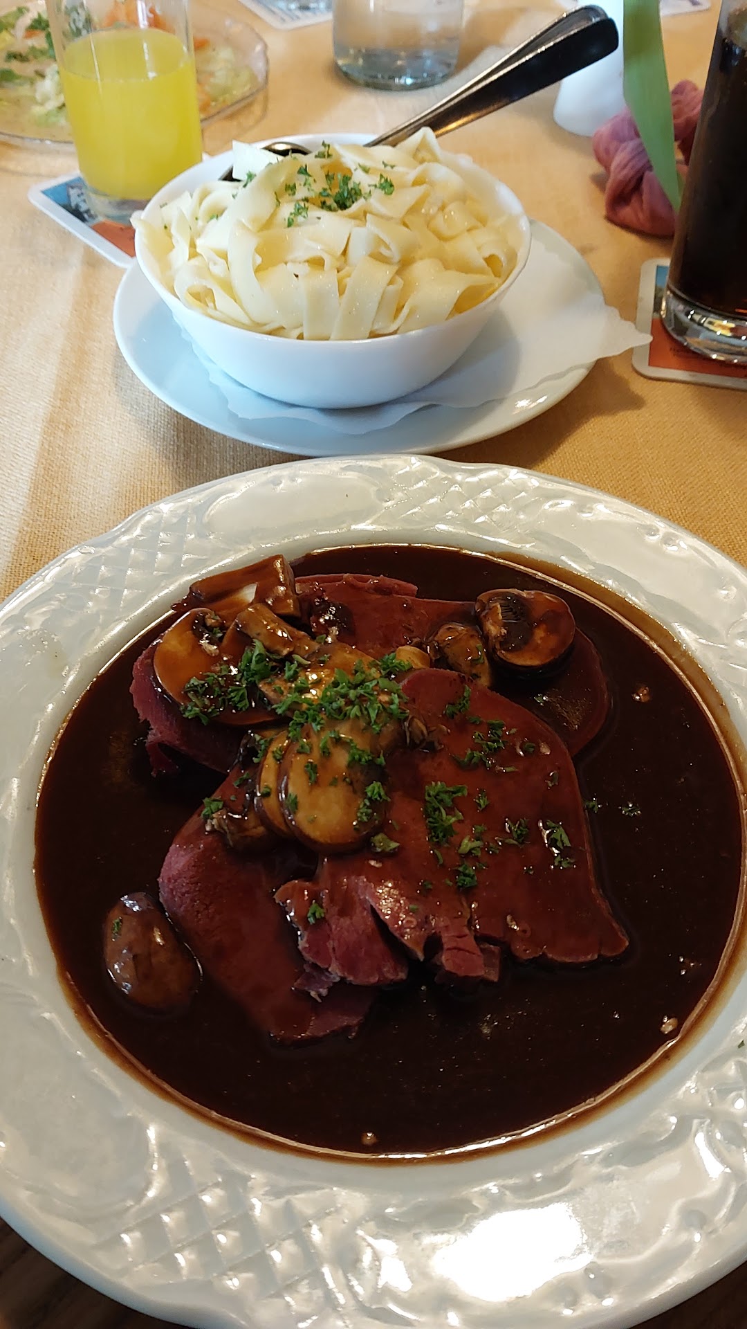 Kalte Brühwürfel Suppe bekommen (zurückgehen lassen "Bitte aufwärmen"), Sauerbraten 1x dünnes Scheibchen kalt (zurückgehen lassen "Bitte aufwärmen"). Sauerbraten zurück, heiß, aber keine Spätzle kamen auch nach 8 Min nicht. Nachfrage: Wo bleiben Spätzle? Dann kamen Spätzle 4 Min später (Sauerbraten wieder kalt... kein Bock mehr). Jüngere Bedienung macht Gesicht als ob ihr etwas gestohlen worden wäre (war uns unangenehm so bedient zu werden).