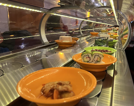 Das Förderband wirkte unhygienisch und wenig appetitlich. Die angebotenen Speisen waren wirr durcheinander: Süsses, Salziges, Warmes und Kaltes kreuz und quer – völlig unstrukturiert. Besonders unangenehm: Ein Hühnchenspiess meiner Begleitung war eiskalt – direkt vom Band. Einfach ekelhaft.