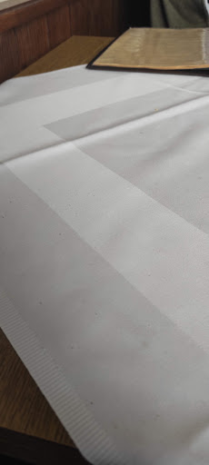 Tischdecke mit Fettflecken, Löchern, und Krümeln - das war eklig. Speisekarte ist alt und abgeranzt. Siehe Fotos.