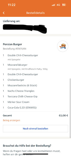 Ich habe gestern Abend bestellt die Lieferung kam 15 min früher an als gewünscht was nicht schlimm ist jedoch war die Bestellung nicht genießbar und dazu noch zu Wucher Preisen es wurden zum Essen zwei Soßen dazu bestellt was natürlich eine lächerliche Menge war was mit einemmal dippen leer war. Hab seid ungefähr 3 Stunden sehr starke Bauchschmerzen und war schon mehrfach auf dem Klo. Obwohl ich das Essen nicht mal zu Hälfte aufgegessen habe. Und wenn es dir nächste Zeit nicht besser wird muss ich wohl zum Arzt und mich dort untersuchen lassen. Ich sollte eigentlich darauf bestehen mein Geld zurück zu bekommen da ich wirklich nicht mehr als schmerzen von dieser Bestellung bekommen habe. Also bitte ich Sie und...