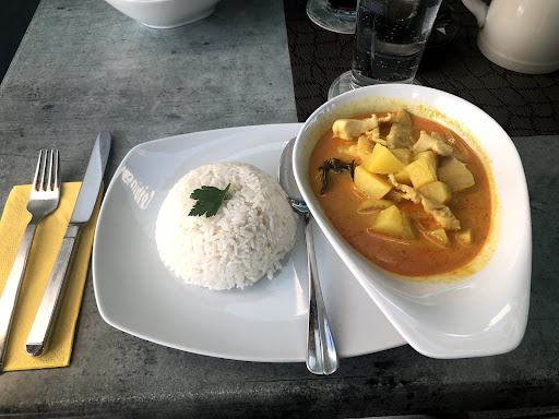 Ich bin zunächst einmal über das Konzept gestolpert, gut bürgerliche Küche und thailändische Küche, das klang seltsam. Dann im Restaurant kam die eigentliche Überraschung. Ich habe komplett thailändisch gegessen, meine Frau komplett deutsch. Und was soll ich sagen, es hat alles wirklich außerordentlich gut gemundet. Ich gebe normalerweise ja keine fünf Sterne für das Essen, das ist eigentlich für die Gerichte aus Sterne Lokale vorbehalten, hier muss man aber wirklich eine Ausnahme machen. Besonders heraus gestochen, finde ich ist, dass das Essen wirklich heiß serviert wurde. Ich habe Mama Suppe zum ersten Gang genommen, das hätte eigentlich auch fast schon für ein Hauptgang gereicht. Achtung, scharf heißt hier auch wirklich scharf, das Trips auch auf diese Suppe zu. Zum Hauptgericht gab es original thailändisches Chicken, auch das sehr, sehr lecker. Hier wieder hervorzuheben ist der Garpunkt des Fleisches. Ich habe selten in einem Lokal so gutes Hähnchenfleisch gegessen, es war nicht zu trocken, nicht zu roh, es war einfach auf den Punkt.