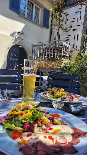 Read moreSuper tolle Atmosphäre in einer typisch Markgräfler Gaststube, draußen eine lauschige Terrasse - was die Örtlichkeit betrifft, geht es nicht besser. Die Bedienung war sehr freundlich, beim Essen blieb jedoch viel Luft nach oben. Die Speisekarte war eigentlich vielversprechend mit typisch badischen Gerichten. Zu wünschen wäre der Krone aber auch ein Herz für Vegetarier (wenigstens) und Veganer (wenn möglich). Bei meiner Suche nach Vegetarischem blieb ich an einer Extrakarte mit Pfifferlingen hängen, auf der allerdings gar nicht jedes Gericht Pfifferlinge bot, wie mir die Kellnerin bestätigte. So blieb mir nur das Risotto, in dem man allerdings eine Weile suchen musste, bis man ein paar winzige Exemplare von Pfifferlingen zutage förderte. Geschmack sollte drübergehobelter Parmesan bringen, da ich keinen Käse esse, blieb als Geschmacksträger ein wenig braune Soße, die wohl die Soße der Ochsenbäckle war...die aß ich dann notgedrungen mit dem Risotto, soweit sie reichte. Viel Risotto musste ich stehenlassen. Mein Mann hatte das Ochsenbäckle... Das war gut. Manko hier: im tiefen Teller schwamm das mit Käse überbackene Gemüse gleich mit in der braunen Soße, die dazu servierten winzigen Knöpfle, ebenfalls mit Käse überraspelt, passten auch nicht. Gut war der Beilagensalat. Nicht ganz satt und zufrieden bestellte ich noch ein Dessert. Die Apfelküchle litten allerdings unter zu altem Fett, in dem sie gebacken waren. Wir kämen gern wieder, aber würden uns...